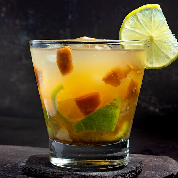 Gelo, limão, rapadura e cachaça.