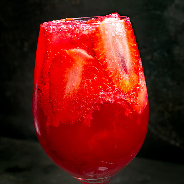 Leite condensado, morango, vodka e suco de limão.