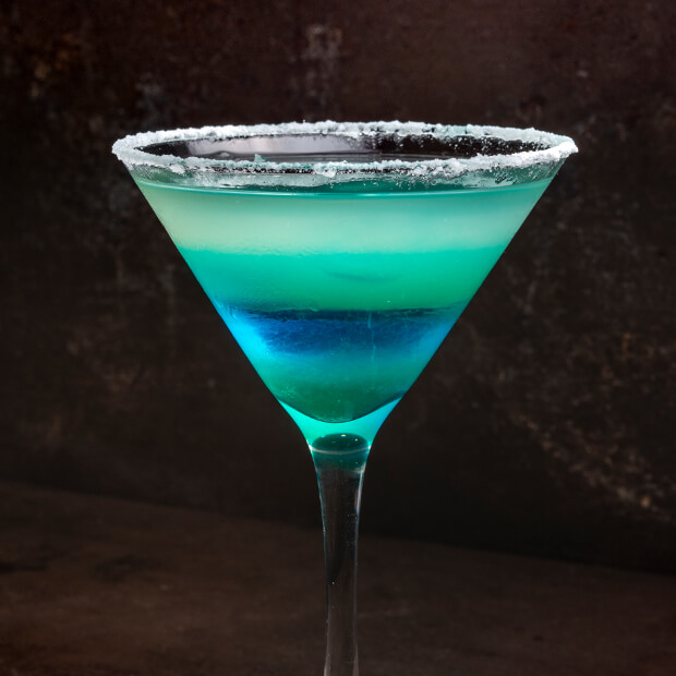 Tequila, caldo de limão, licor de pêssego, Curaçau Blue, gelo e corda de sal.