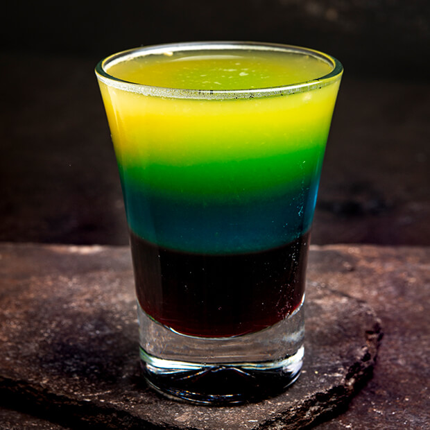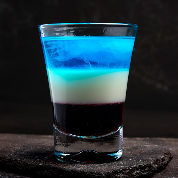 Groselha, Curaçau Blue e Vodka. Servido em chamas.
