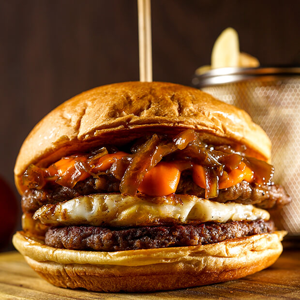 Pão, 2 hambúrguers, cheddar, ovo e cebola caramelizada.