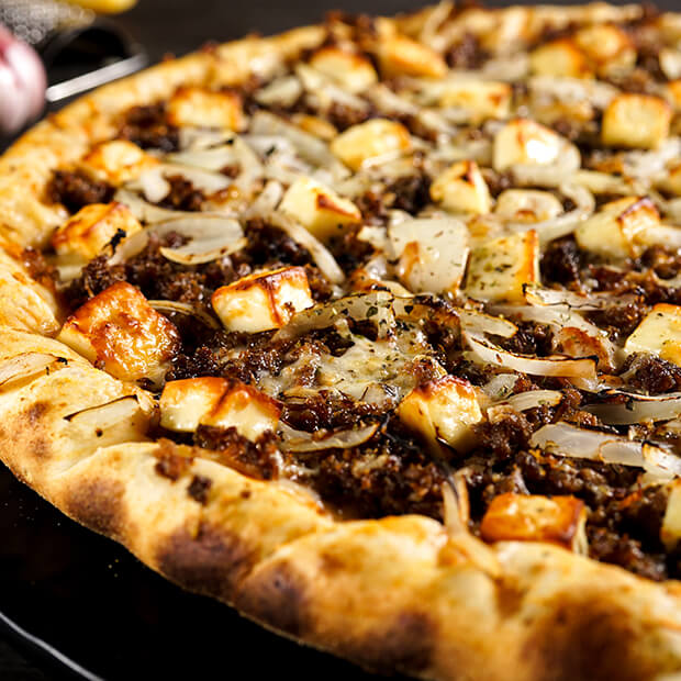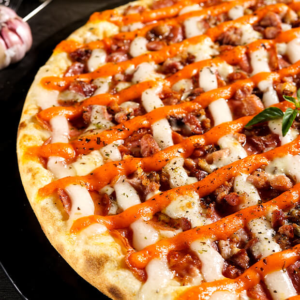 Mussarela, calabresa, bacon, catupiry, cheddar e orégano.
