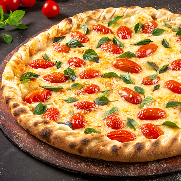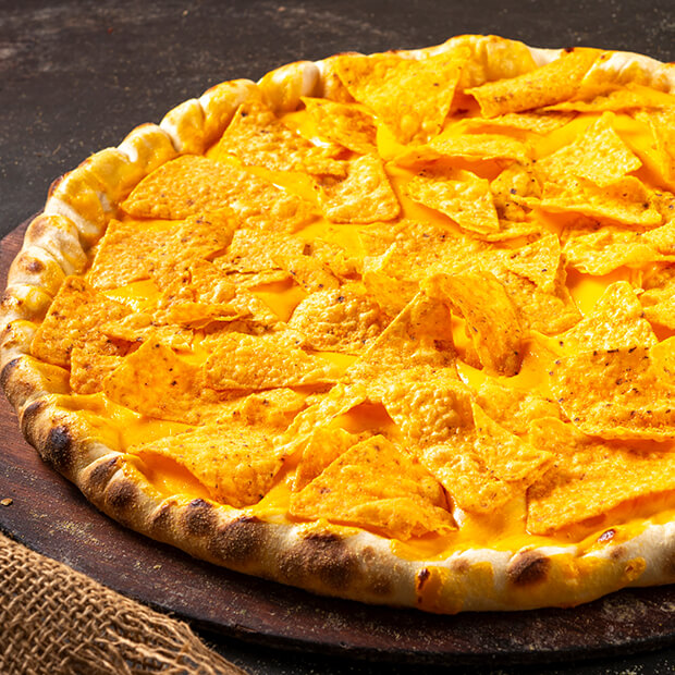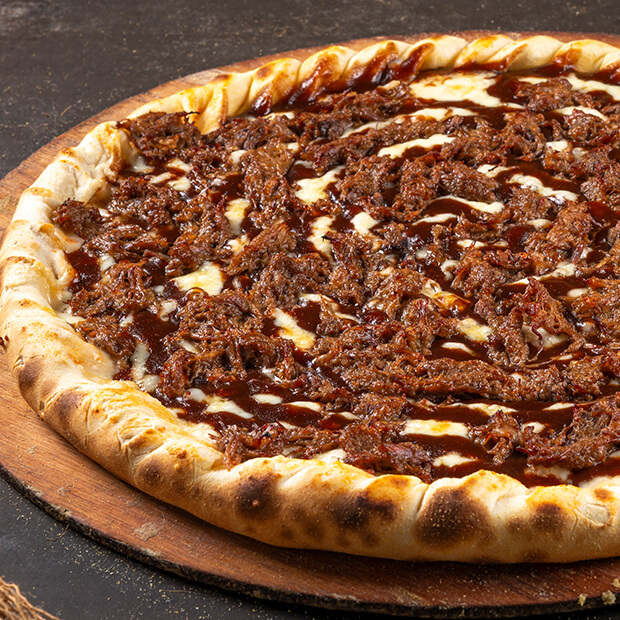 Mussarela, frango, calabresa, bacon, cheddar, catupiry e orégano.