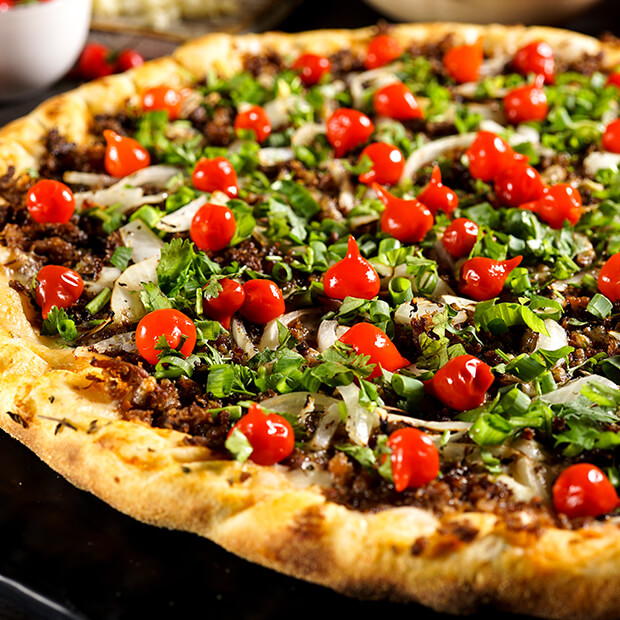 Mussarela, carne seca, cebola, pimenta biquinho, manteiga de garrafa, cheiro verde e orégano.